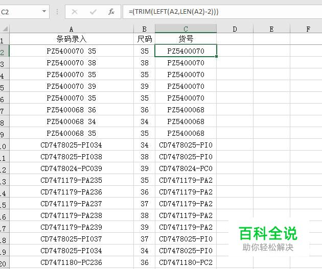尺码分离出来了,接下来继续提取货号,货号位于条码数据左侧,我们通过LEFT函数来实现