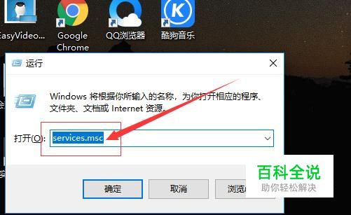 在打开的运行界面的空白栏输入”services.msc“,点击确定,如图所示。