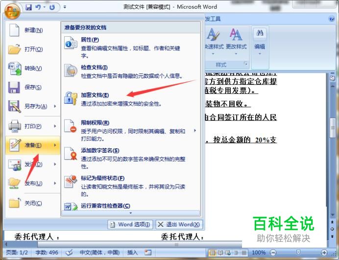 在弹出的选项中,我们选择准备--加密文档