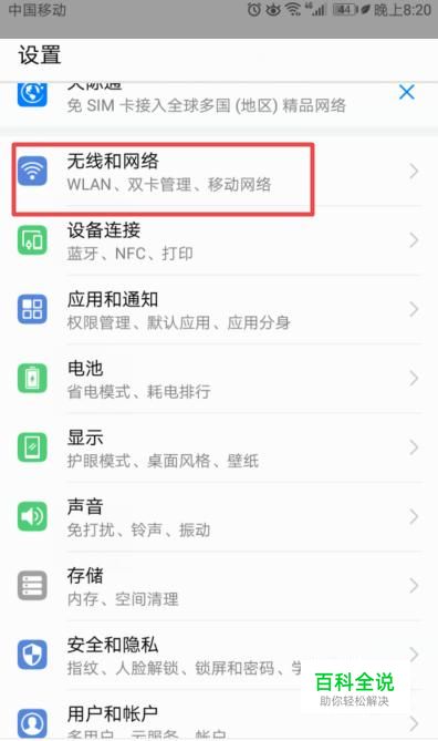 弹出的界面,我们点击无线和网络;