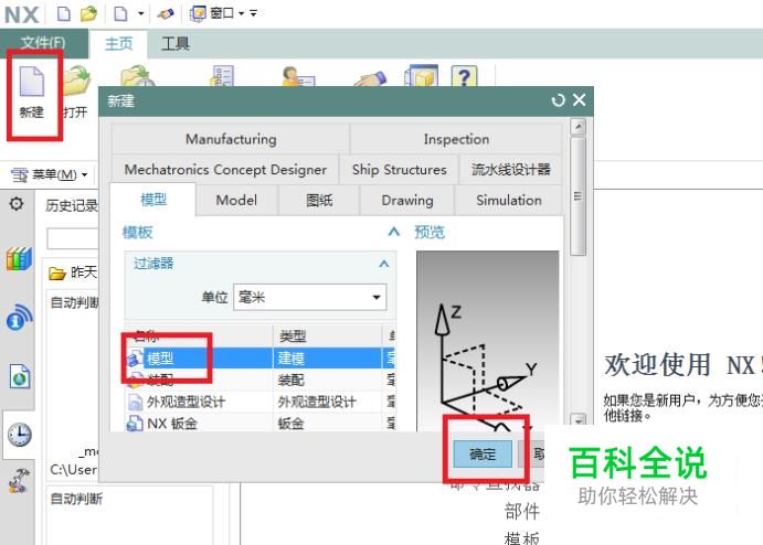 如下图所示, 打开UG10.0软件, 在主页工具栏中点击“新建”图标, 然后弹出一个“新建”对话框, 在对话框中选择“模型”, 再点击“新建”对话框下方的“确定”, 至此, 一个空白的模型文件创建成功了。