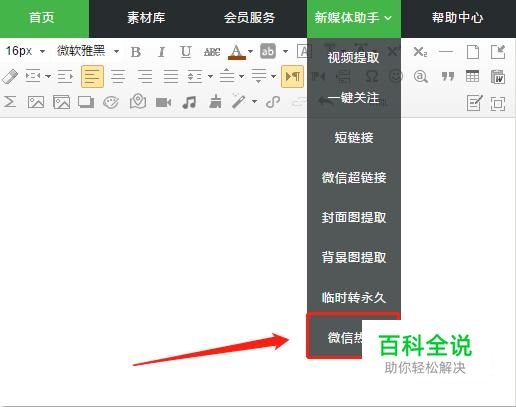 点击顶部导航栏的“新媒体助手”——“微信热文”。