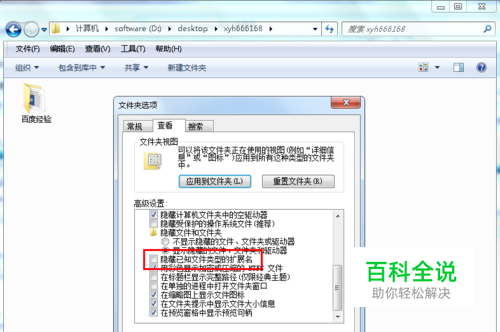首先打开文件夹选择,然后去掉“隐藏已经文件类型的扩展名”,然后点击下面的应用和确定按钮,将文件的扩展名显示出来,为我们后面的修改做好准备