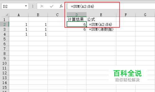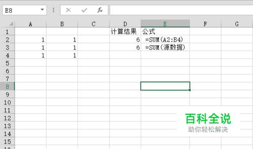 函数作为名称:比如,我们把上例中,【A2:B4】区域求和的结果定义一个名称叫做【源数据求和结果】,那么就可以在其他的公式中,引用这个名称了,如图,这样使用是不是比较方便呢?