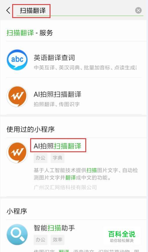 在小程序里面搜索“扫描翻译”,选择一个搜索结果。