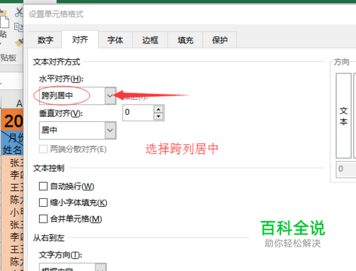 第二步:【设置单元格格式】——【对齐】——【水平对齐】——选择【跨列居中】——回车键确认,即可。如图所示: