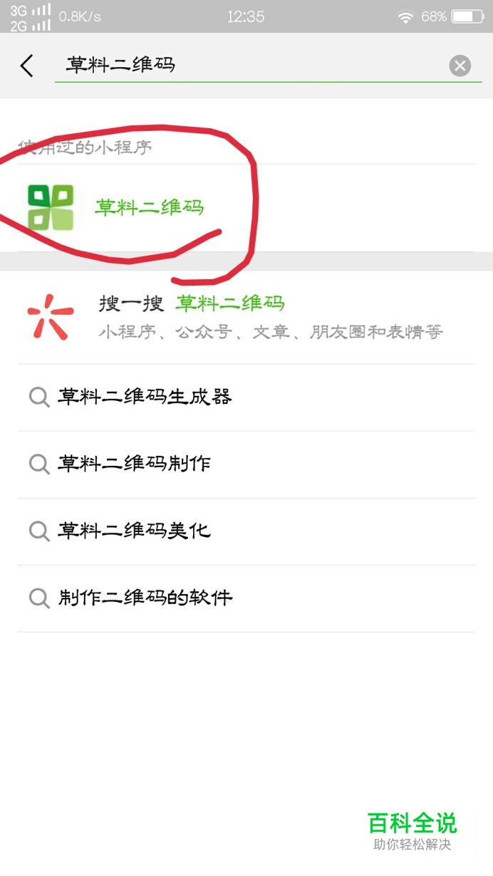 接下来,大家点击任何一个主页面的右上角的“查找”,我们搜索“二维码”便会出现“草料二维码”我们点击进入
