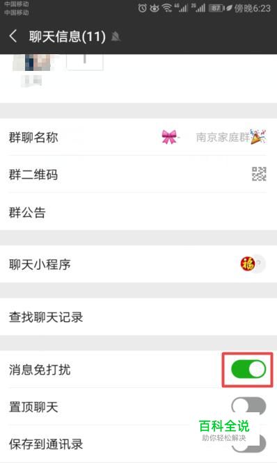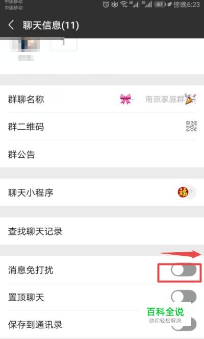 弹出的界面,我们将消息免打扰的开关向右滑动;
