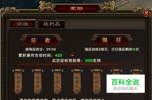 在赤壁之战游戏中,当玩家参与剧情到一定程度时,可获得征收的权利,征收可获得玄铁和银元奖励。 征收令每两个小时回复一个,个数上限为30个。 赤壁之战玩家可通过界面上的奖励按钮进入征收界面。赤壁之战普通征收,每次征收必将获得玄铁,且征收有概率双倍暴击,获取双倍奖励。每次征收将消耗一个征收令。赤壁之战强征是普通征收的玄铁的二倍,每次征收不消耗征收令,但消耗元宝。元宝消耗起始为值2银元,依次递增。赤壁之战征收的奖励跟所通过斩将的章节有关,每通关一章斩将,征收奖励获得相应的加成。