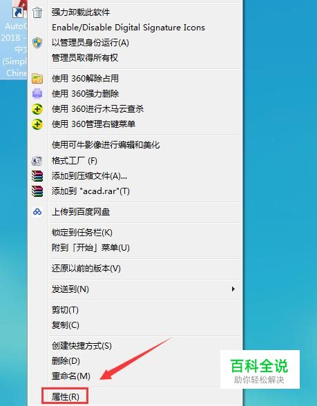 在桌面上找到CAD的快捷图标,单击鼠标右键,在右键菜单哪里找到属性选项,如图所示: