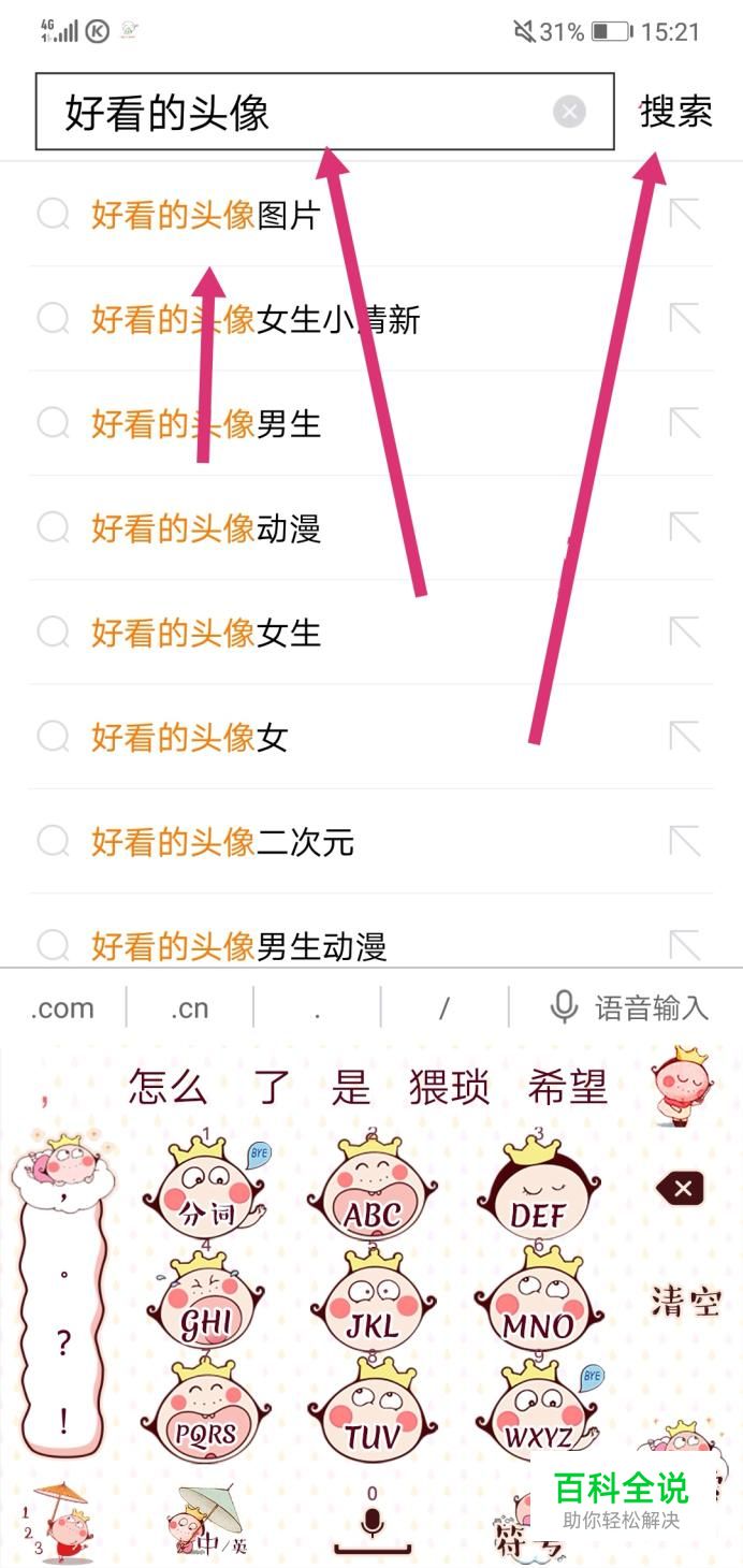 然后,点进去后,在搜索栏里面输入文字“好看的头像”,选择符合你要求的点击它,或者直接点“搜索”。