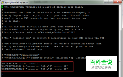 修改用户配置文件:/etc/sysconfig/vncservers 去掉下面这两行前的“#”,也就是说把这两行的注释给去掉。 VNCSERVERS="1:root 2:root"VNCSERVERARGS[1]="-geometry 1024x768 -depth 32" VNCSERVERARGS[2]="-geometry 1024x768 -depth 32"