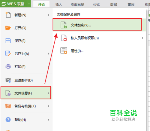wps2016版本的exce文件加密步骤:1.单击“开始”菜单栏的左边的那个图标菜单,选择“文件信息”中的“文件加密”选项,如下图