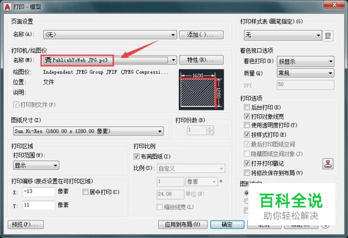 点击打印选项在弹出的对话框内找打打印机绘图仪名称选项,在这里可以设置打印,如图所示: