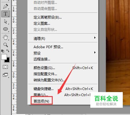 点击编辑菜单在其下拉菜单那里找到首选项选项,如图所示: