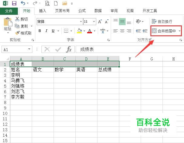 打开excel在单元格里我们输入表格内容,然后选择表头在上面找到合并居中选项,如图所示: