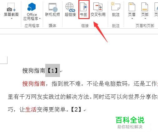 使用word将我们的文档打开,然后在上面找到插入菜单里的书签选项,如图所示: