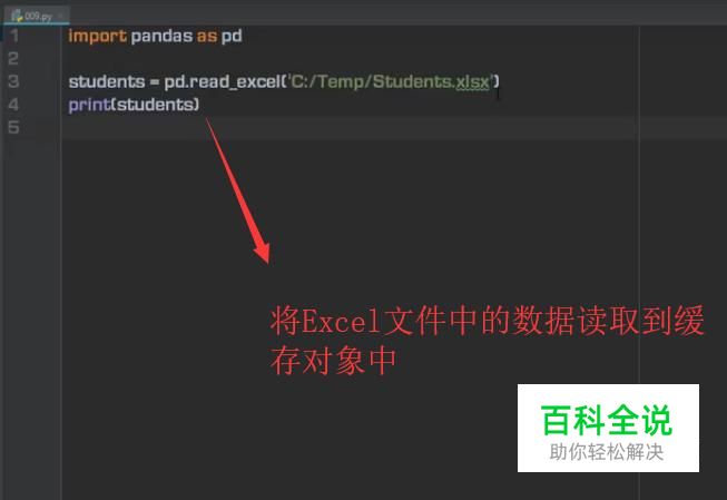 接下来在Python文件中导入pandas库,然后将Excel文件加载到缓存对象中,如下图所示