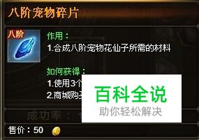 八阶宠物碎片作用: 合成八阶宠物花仙子所需的材料,许多玩家想要一睹八阶宠物花仙子所能带来的伤害以及辅助作用,这个八阶宠物碎片是不可缺少的一部分,必须拥有这个材料才能合出花仙子。三个七阶宠物碎片才能合出一个八阶宠物碎片。很不容易呢! 八阶宠物碎片获取方式: 1.使用3个七阶宠物碎片合成获得 2.商城购买 大家可以通过打世界BOSS和BOSS之家里的BOSS来获取一阶宠物碎片,使用一阶宠物碎片一步步的合成可以得到八阶宠物碎片。是不是很麻烦呢,不用担心,可以在游戏的商城内直接购买获得八阶宠物碎片。只是价格不菲哦~有一定实力的玩家可以来尝试获得~