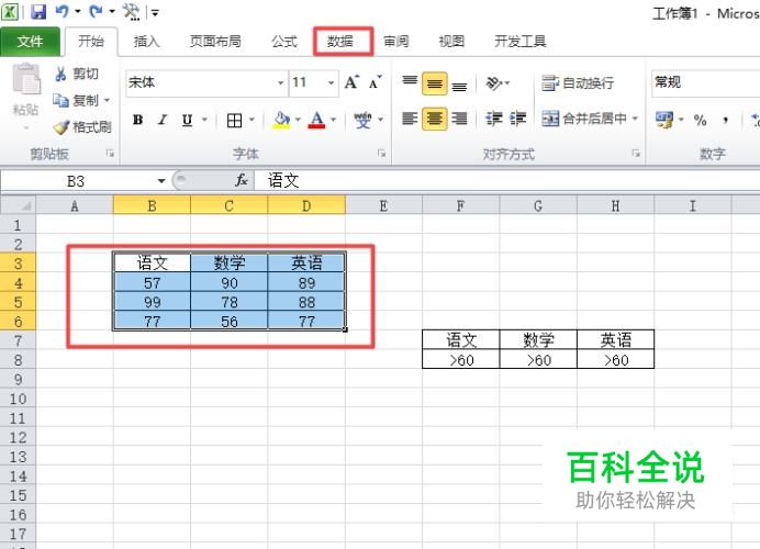 之后我们点击选中图示中的区域,然后点击工具栏中的数据;