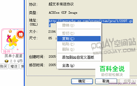在弹出的“属性”窗口就可以看到图片文件的路径,如下图:复制下来就是:http://imgcache.qq.com/qzone/space_item/pre/1/2097.gif 但是这个不是挂件图案的地址,要把pre—改为orig: 例如:http://imgcache.qq.com/qzone/space_item/pre/1/2097.gif (装扮空间里的挂件展示的地址) 改为:http://imgcache.qq.com/qzone/space_item/orig/1/2097.gif (实际的挂件图片地址) 打开 http://imgcache.qq.com/qzone/space_item/orig/1/2097.gif 查看该图片的属性,可以看到尺寸是55 X 180 ,就是 宽度X高度 。