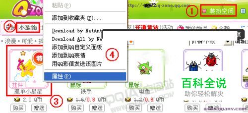 QQ空间挂件使用方法来免费使用官方的QQ空间免费挂件Banner,道理是一样的,就是用QQ空间相册来实现。①打开“装扮空间” → ②打开“小装饰” → ③选择挂件 → ④在挂件图片上点右键,如下图: