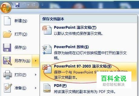 方法三、在PowerPoint2007中将PPTX转换成PPT格式 可以找一台安装了PowerPoint2007版本的电脑或者找个使用2007版本的朋友帮你转换一下,步骤非常简单。 将PPTX的文件在PowerPoint2007版本中打开,然后单击“Office按钮”然后选择“另存为”在右边选择“PowerPoint 97-2003 演示文稿”最后单击“保存”按钮即可转换完成。
