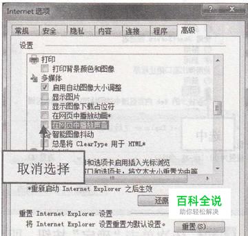 步骤2:在“多媒体”选项区中,取消选择“显示图片”、“在网页中播放动画”和“在网页中播放声音”复选框,如下图所示。