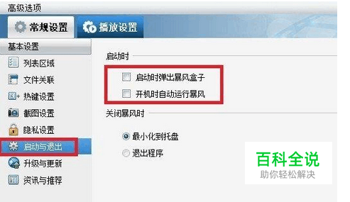 进入高级选项设置后,我们在“基本设置”中首先找到“启动与退出”设子,将“启动时”下面的两个勾都去掉,如下图