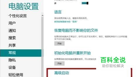 第二步:在“常规”选项中,最后一个“高级启动”,选择“重启”就可以;