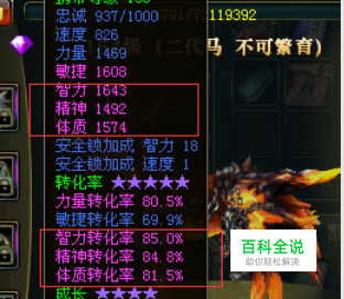 马匹炼化: 炼化其实很重要,能加许多属性。法攻职业,需要注重智力、体质、智力转化率、体质转化率;物攻职业,需要注重力量、体质、体质转化率、力量转化率;奶扇:智力、体质、精神、智力转化率、体质转化率、精神转化率。