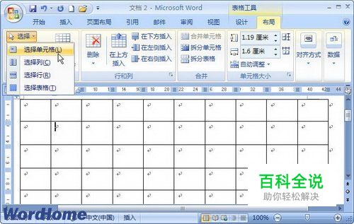 用户还可以在单击准备选中的单元格后,在“表格工具”功能区的“布局”选项卡中,单击“表”分组中的“选择”按钮,并在打开的选择菜单中选择“选择单元格”命令,如图2009010809所示。图2009010809 选择“选择单元格”命令