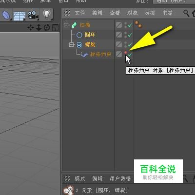 同时选中圆环对象与螺旋对象,并拉向扫描对象,当出现向下箭头时,再放开手,那么,圆环对象与螺旋对象成为扫描对象的子级。