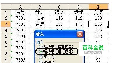 1、右键单击E3单元格(106分),左键单击“插入”,在打开的“插入”对话框中选择“活动单元格下移”,然后点“确定”,这时就会把E3单元格给空出来,而其原数据则被推到了E4单元格中……我们在其中直接输入孟庆的英语成绩109就行了。(如图2)