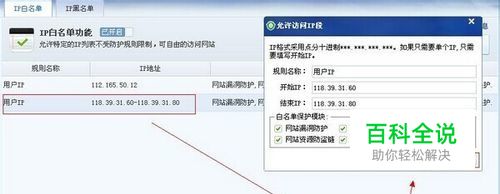 一、IP白名单的添加 打开网站安全狗IP黑白名单功能界面并开启功能。点击界面上的“新增”按钮,在弹出的“允许访问IP段”框中填写需要加入白名单的新人IP,并设置“白名单保护模块”【注意不要把经常攻击的IP添加进来】