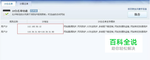 同时,对于以前设置的规则,用户也可以对其进行修改,选中需要修改的规则,然后点击“修改”按钮,安全狗会弹出修改窗口,用户此时就可进行相应的修改,如重新选择某个“白名单保护模块”等。修改完之后选择“允许”。最后别忘了在IP白名单功能界面点击“保存”哦。