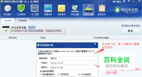 在白名单规则中,我们可以设置单个IP地址,也可以设置IP段(V3.1版开始支持跨段IP段)。单个IP的添加只需填写开始IP即可。