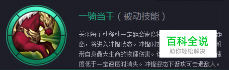 一骑当千(被动技能) 关羽每主动移动一定距离速度将提高,移动达到一定距离,将进入冲锋状态。冲锋时对敌人造成普攻伤害并附带自身最大生命的物理伤害。该姿态下关羽攻击或者速度低于一定速度时消失。冲锋姿态下普攻可击退敌人。