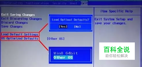 进入BIOS设置界面后,按下键盘上“→”键将菜单移动至“EXIT“项目,按下键盘上“↓”按键选择到” OS Optimized Defaults“选项,按下“回车”键打开该选项的设置菜单,按下键盘上“↓”按键,将该选项默认的”Win8 64bit“修改为”Others“之后,按下“回车”键确认。之后按下键盘上“↑”按键选择到”Load Default Setting“选项,按下回车键启动恢复BIOS默认功能窗口,在该窗口中直接按下笔记本键盘上的”回车“键启动BIOS恢复默认功能。之后再按下笔记本键盘上“F10”键或“Fn键+”F10“键启动BIOS保存设置窗口,在该窗口中直接按下笔记本键盘上的”回车“键启动BIOS保存设置并诚信启动计算机功能。