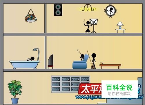 第一关:先点浴缸里的人,这个人会上楼去找唱歌的女人,开门时点女人,外面的人会兴奋得来回跑,撞墙而死。 下面浴缸里的水流出,流到右侧房间,先点站在沙发后面的人,他拿起笤帚捅了几下,再点桌子上的杯子不小心砸死自己。 点沙发上睡觉的人,他会开电视时触电而死。 最后点唱歌的女人头上的电灯,砸死她。