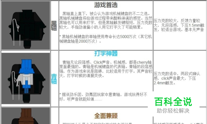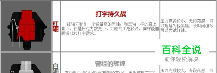 什么是机械键盘? 机械键盘与其它结构的键盘区别在于,每一颗按键都有一个单独的开关来控制闭合,这个开关也被称为“轴”。机械轴的种类也比较多,包括Cherry机械轴、早期日产ALPS轴、台湾ALPS简易轴、台湾白轴等。但是由于cherry MX轴的广泛使用,如果不特意提及是什么种类的机械轴,一般指的都是cherry MX机械轴。 Cherry MX机械轴是广泛应用于机械键盘领域的一种机械轴,按颜色分为黑、红、青、茶、白等多种颜色,每种颜色的轴手感各有不同。由于绿轴灰轴之类比较稀少,基本只出现在cherry键盘的空格键上,以下仅介绍青轴、黑轴、红轴、茶轴、白轴。 各种机械轴的区别 相关名词解释
