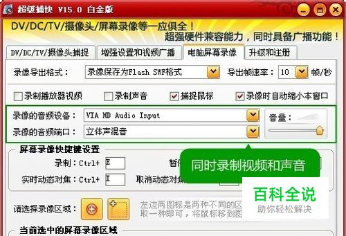 同时录制视频的声音,自定义录像区域 超级捕快还可以边录视频边录声音。只需在“录像的音频设备”和“录像的音频端口”处设置正确的选项即可。然后使用橙色录像区域选择工具,即可自定义录像范围,以免录制到自己不想要的视频画面。