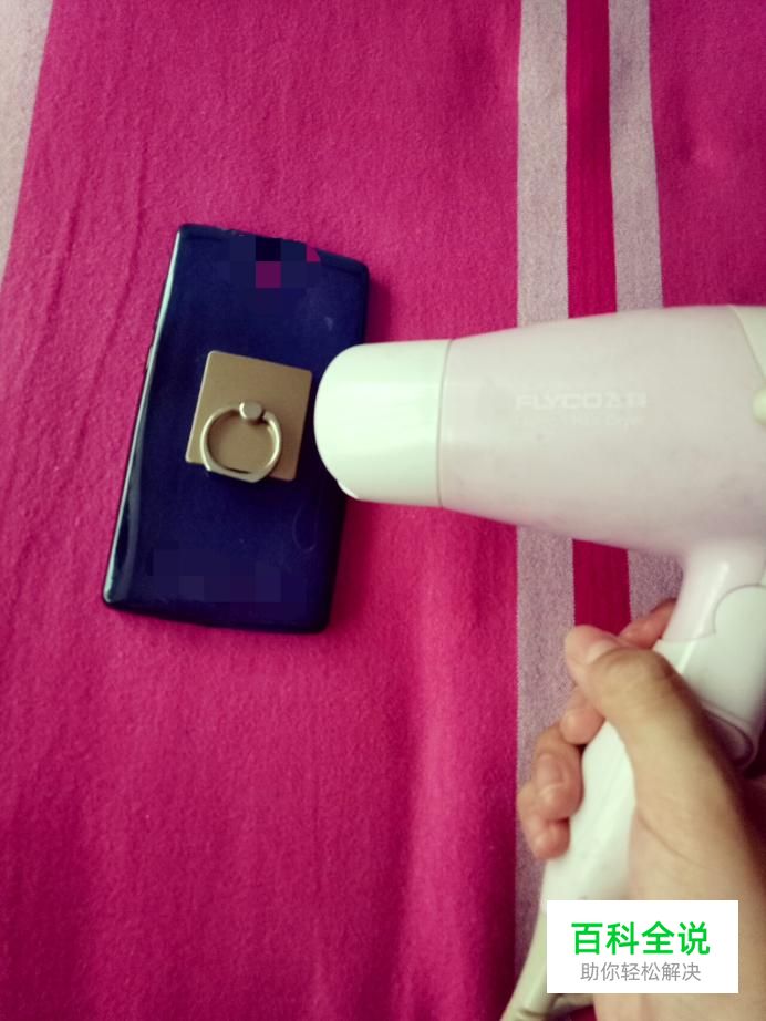 把吹风机的吹风口对准粘贴指环扣的底部,吹至2~3分钟。