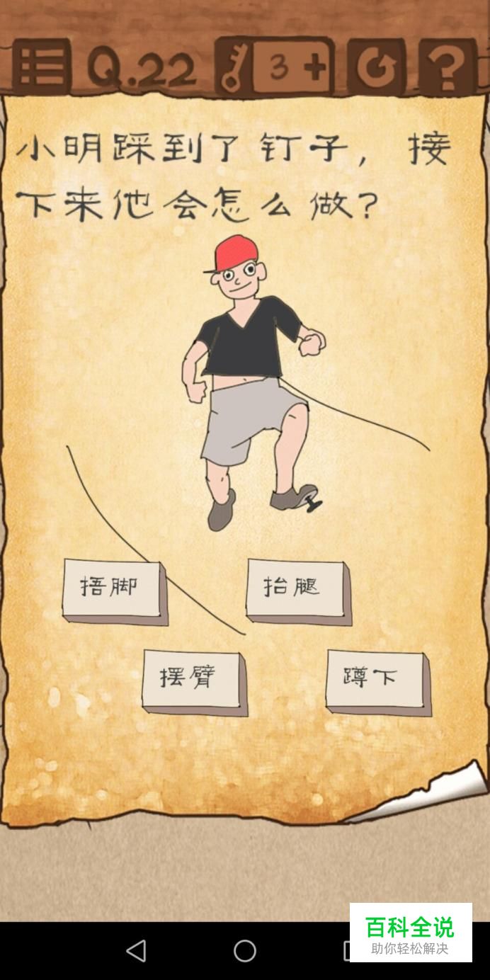 《最囧游戏3》第二十二关卡解析:游戏提示小明踩到钉子,接下来他会怎么做?相信这一关难倒了很多玩家,这一关的技巧却是让人难以琢磨。