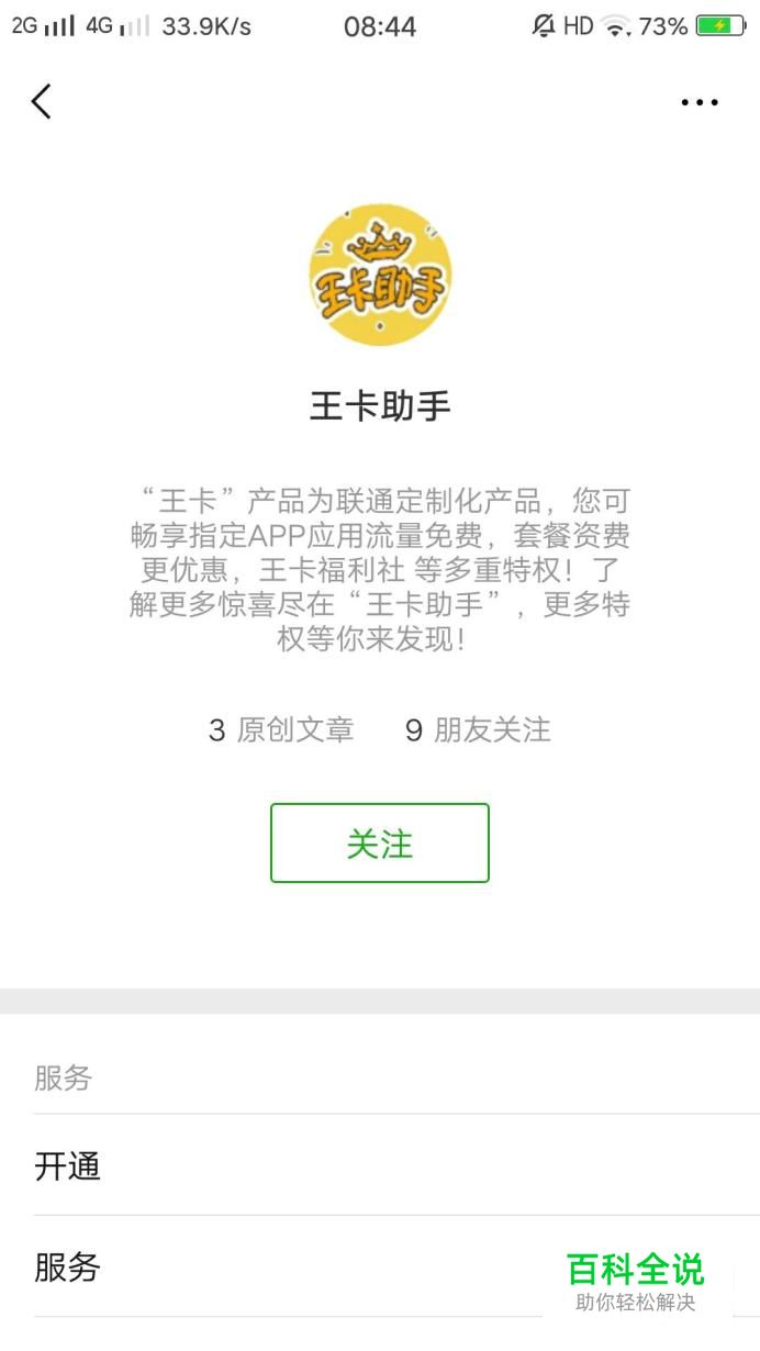 打开手机,进入微信,在添加公众号的地方搜索“王卡助手”,将其添加到公众号里面。