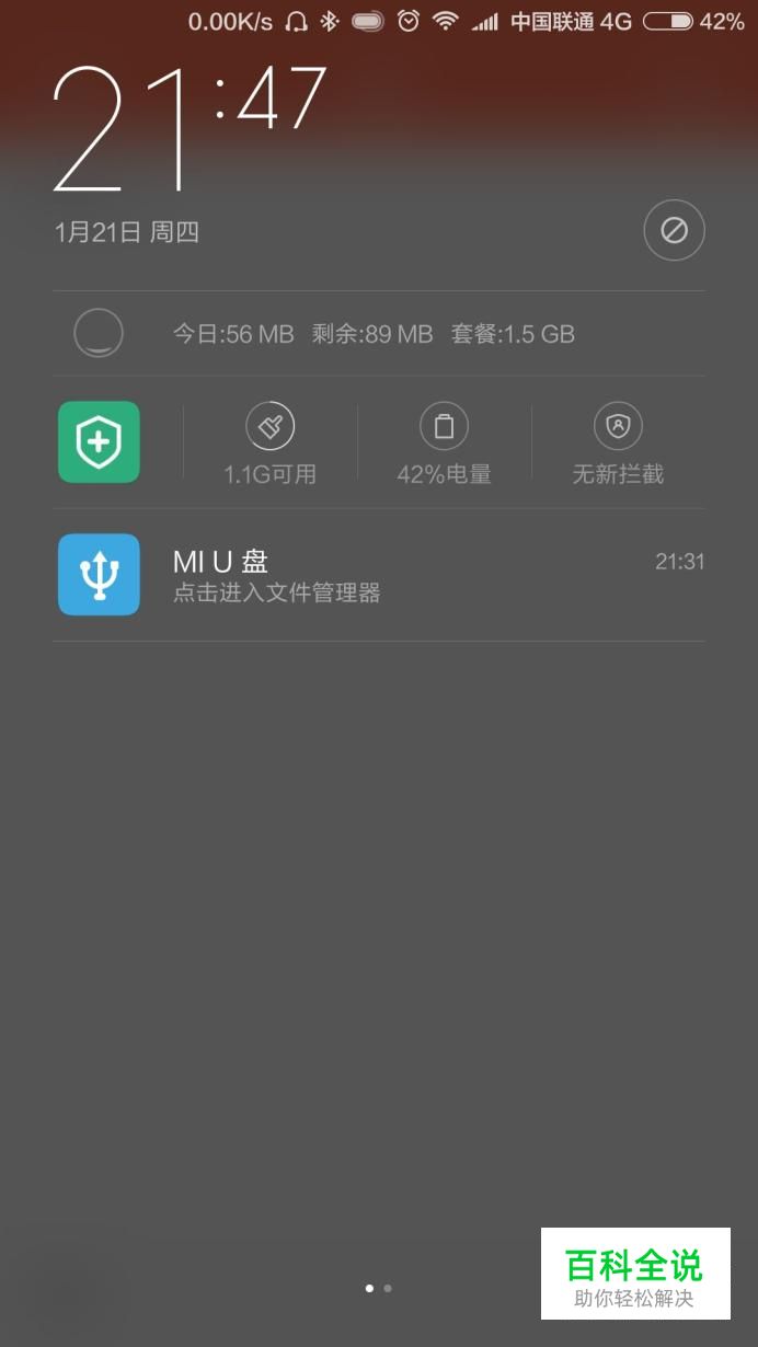 一般情况下如果有一些设备连接手机的时候,手机都会有自我保护看一下有没有截拦,我们应该在通知栏中找到u盘的信息,允许设备访问手机。