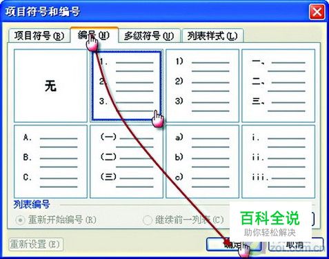 点击“格式”菜单中的“项目符号与编号”命令,在弹出的“项目符号与编号”窗口中的“编号”标签下,选中合适的编号类型后点击“确定”。 项目符号与编号