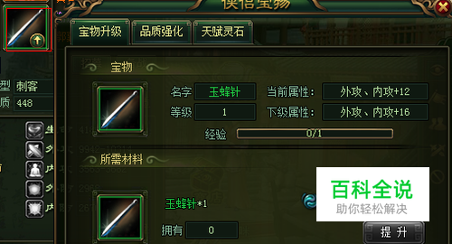 1、 宝物升级:对宝物进行升级可以提升侠侣的外功和内攻,没提升一次需要消耗1个 “玉蜂针”和5000感悟,宝物等级越高,可增加的额外属性越多。 2、 品质强化:对暗器进行强化石可以提升星盘效果,每次提升需要消耗一定数量的元宝,提升有一定的成功几率。提升品质越高,可获得的属性效果越好。 3、 天赋灵石:灵石我们可以通过参加获得或者是如上图,通过迷阵副本兑换获得。