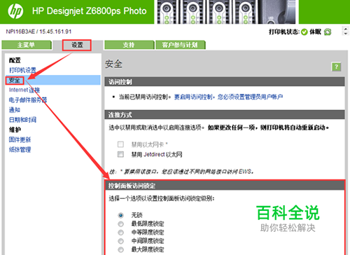 如果不想打印机前面板菜单中的设置(如打印机IP地址等)被随意更改,可尝试在浏览器中输入打印机IP地址,访问打印机内嵌式 Web 服务器(EWS),在 设置—安全—控制面板访问锁定 进行设置。