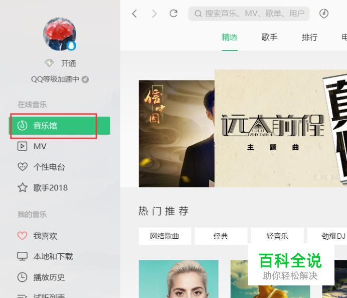 这里以QQ音乐软件为例,打开QQ音乐软件主页面,点击进入“音乐馆”菜单。